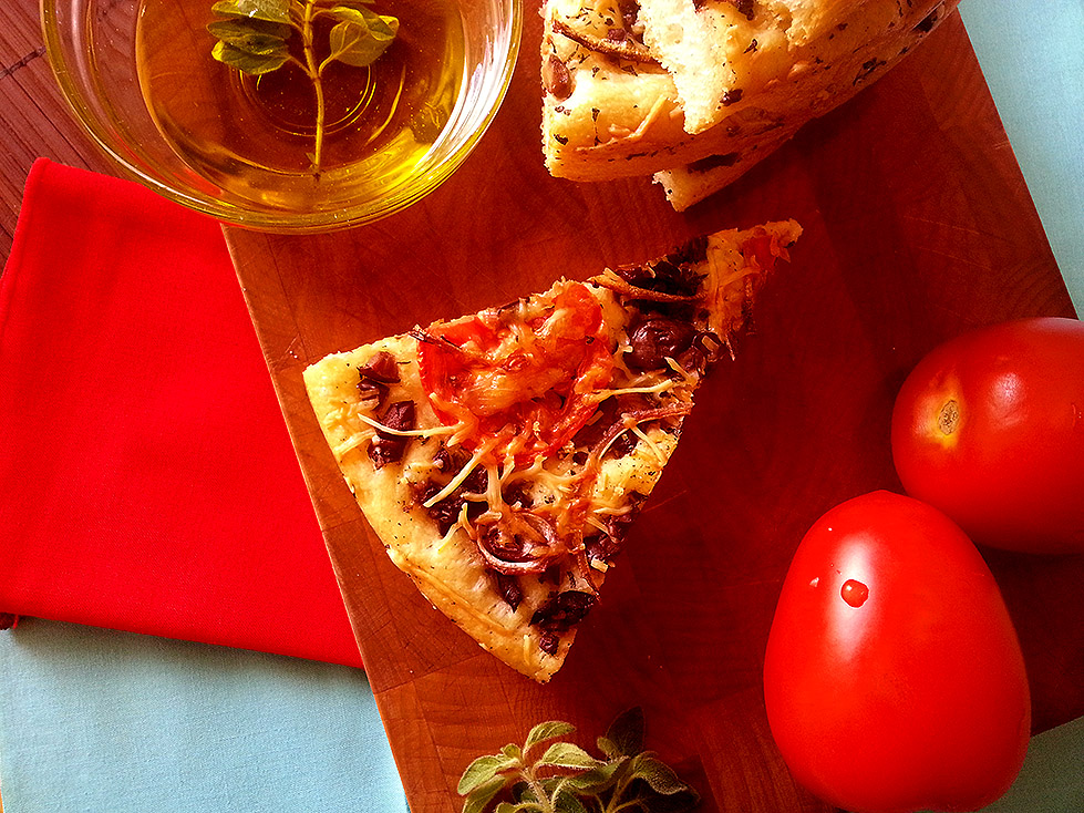 olive focaccia with tomatoes + onion