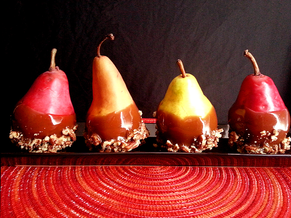 The caramel has a lot of depth of flavor from the molasses and maple syrup. It pairs wonderfully with the firm, grainy and sweet pears! Try it and tell me you don’t like it as much or more than caramel apples. I think these look very elegant and the variety of pears make for a beautiful range of colors, perfect for the season!