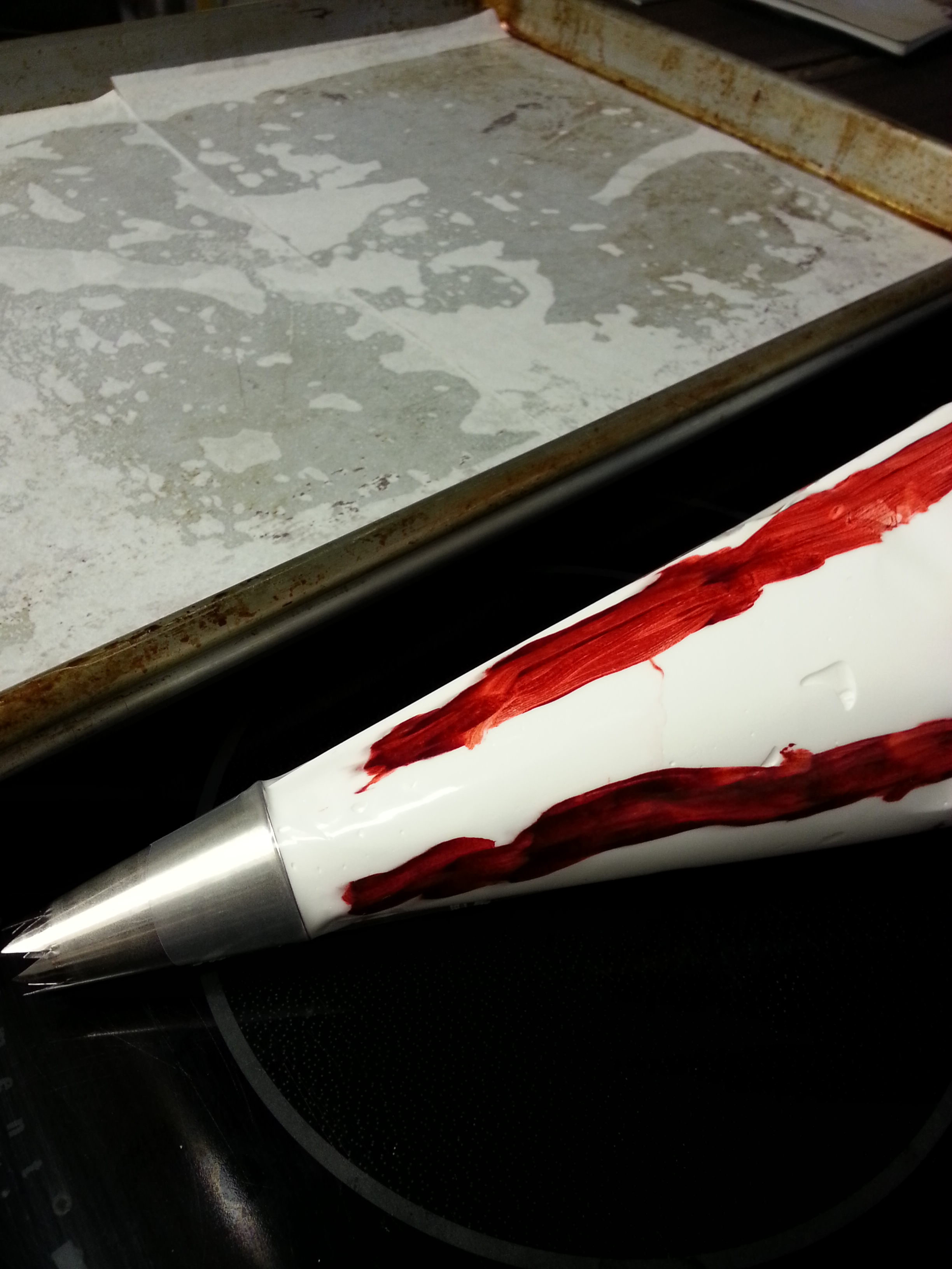 Carefully spoon the meringue into the piping bag (I was able to fit all my meringue in the one 18 inch bag), and squeeze a little of it back into the mixing bowl until you see the red starting to come out; the first little bit of meringue will still be white until it picks up the color that you painted in the bag.