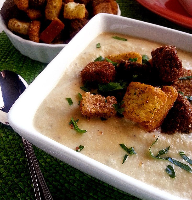 I’ve made this soup three times since Thanksgiving, and each time, I love it more. I was a bit skeptical at first though, cause… cauliflower? It always just struck me as so bland and tasteless. On the contrary, it actually has a very earthy flavor and the roasted garlic just highlights it perfectly! This is the perfect cold-weather soup, and I know many of you are suffering through bitterly cold temps and piles of snow. Here in AZ though, it’s feeling more like we skipped right over winter and just headed directly into spring! No matter, it’ll still fill your belly comfortably, regardless of the outside temperature. The first time I made it, I garnished the individual servings with some parmesan crisps and homemade parsley oil, but you could jazz this up any number of ways. Maybe some thinly sliced toasted garlic in olive oil spooned over the top, or a sprinkling of toasty pine nuts? This time around, I just went with some seasoned croutons and chopped fresh parsley. It’s also plenty good unadorned, if you’d like to go that route, too. Let’s make some soup!