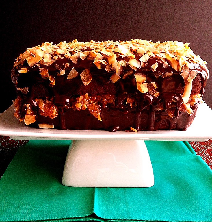 To assemble the cake: Remove the cooled cake from the plastic wrap and slice in half lengthwise. Place the bottom half on a decorative platter. Heat the ganache until warm and melted, and pour half over the bottom of the cake. Warm the coconut-pecan filling in the microwave until about room temperature, and spread over the ganache layer on the bottom half of the cake. Top with the second half of cake, and pour the remaining ganache over the top so that it runs over the sides. Sprinkle the top with the toasted unsweetened coconut. Let the cake set up in the fridge, then slice and serve!