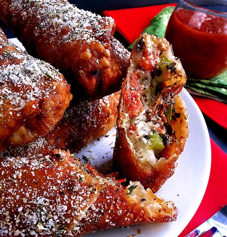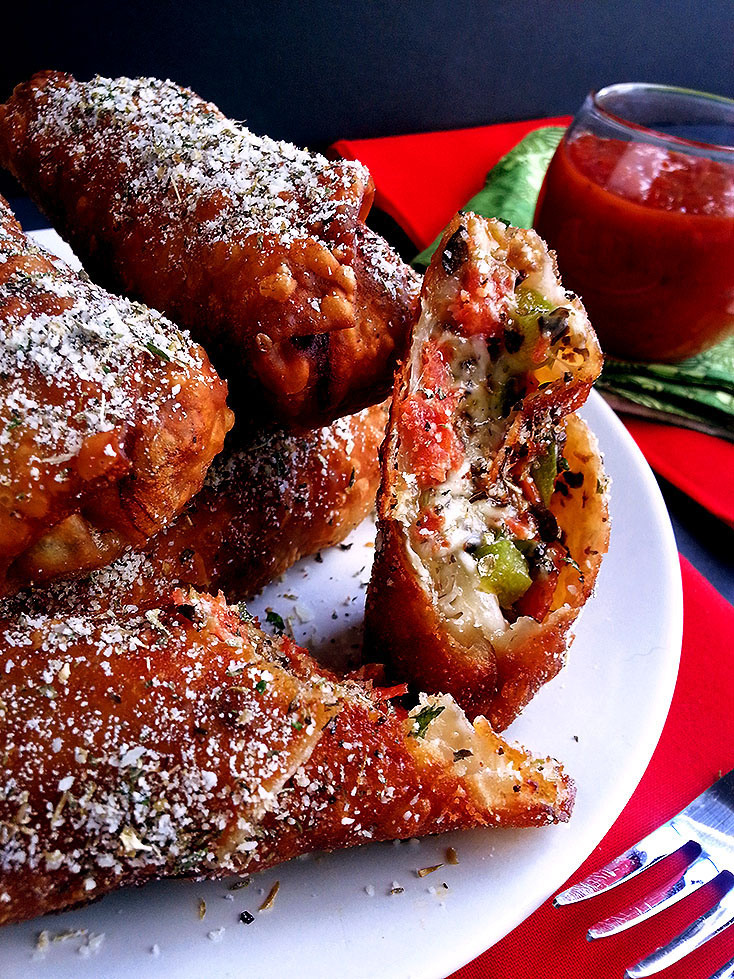When I think of a celebration, I think back to childhood pizza parties complete with many friends, arcade games, lots of presents and of course glorious, delicious pizza! This is my speedy take on pizza, in the form of a handy, portable eggroll. Stuffed with gooey mozzarella cheese, pepperoni, black olives, green bell pepper and dusted with a cheesy-herby sprinkle, you can take ’em with you! You’ll be remembered as that awesome person who shared pizza eggrolls with everyone. Guaranteed to make work meetings and trips to the dentist’s office much more fun and exciting!