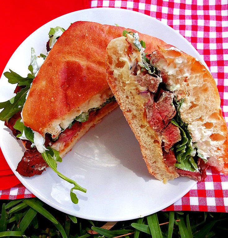 steak sandwiches with arugula, roasted garlic + horseradish cream