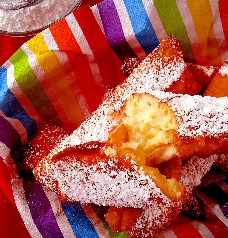 Deep fried cheesecake seems to have gotten its crunchy start at the Texas State Fair, and I can’t say I’m surprised — it seems like a very Texan thing to do. Wrap up some cheesecake filling in a tortilla (or in this case, won ton wrappers), drop it into a bath of hot oil and, once crispy and browned, shake on an obscene amount of powdered sugar. It’s just the sort of indulgent fair food that you can make at home!