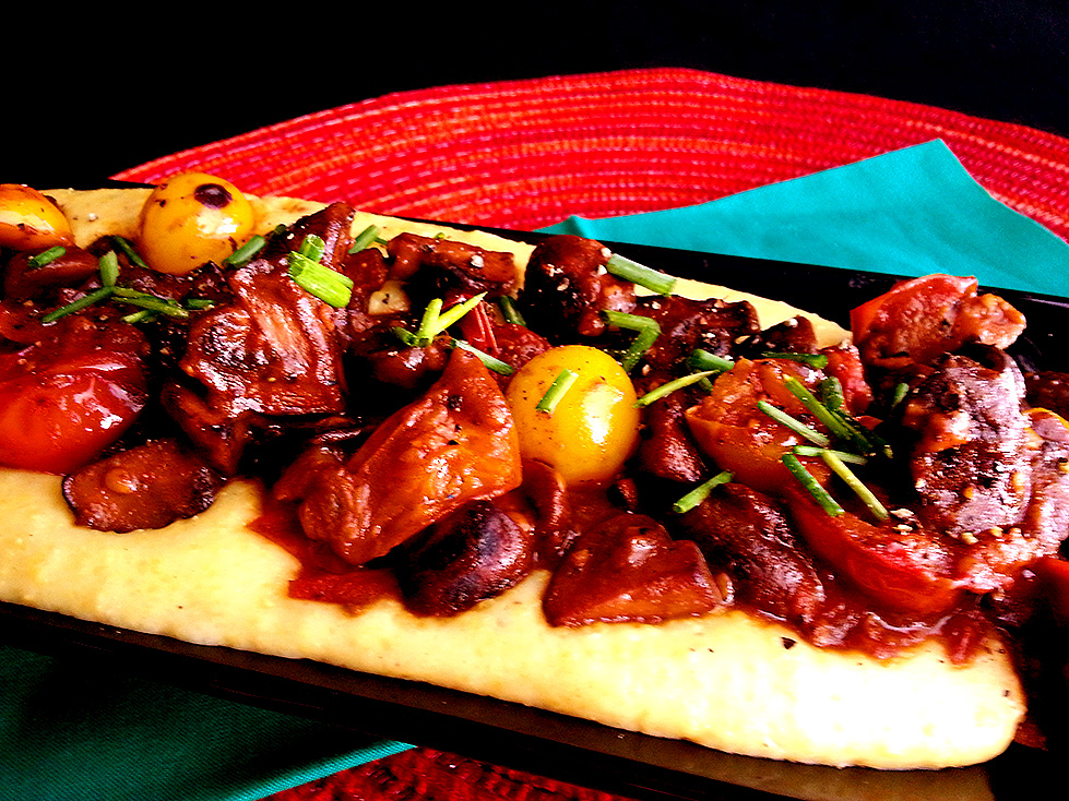 creamy polenta with gouda, portobello mushrooms + tomatoes