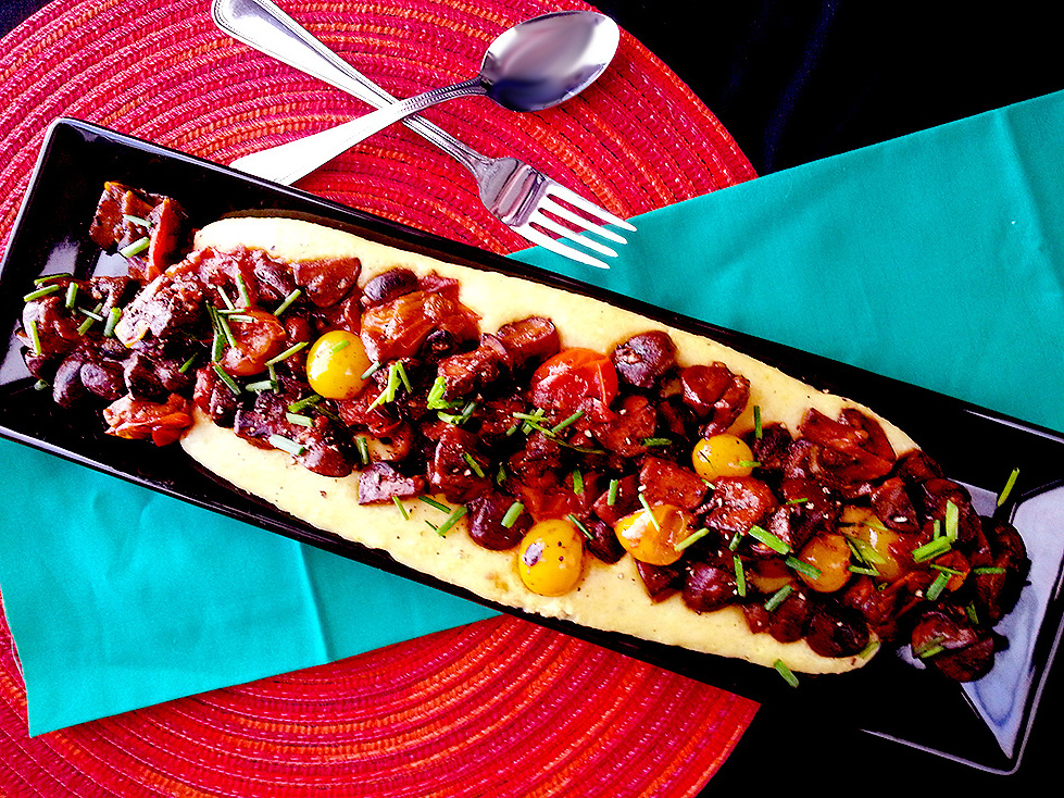 creamy polenta with gouda, portobello mushrooms + tomatoes