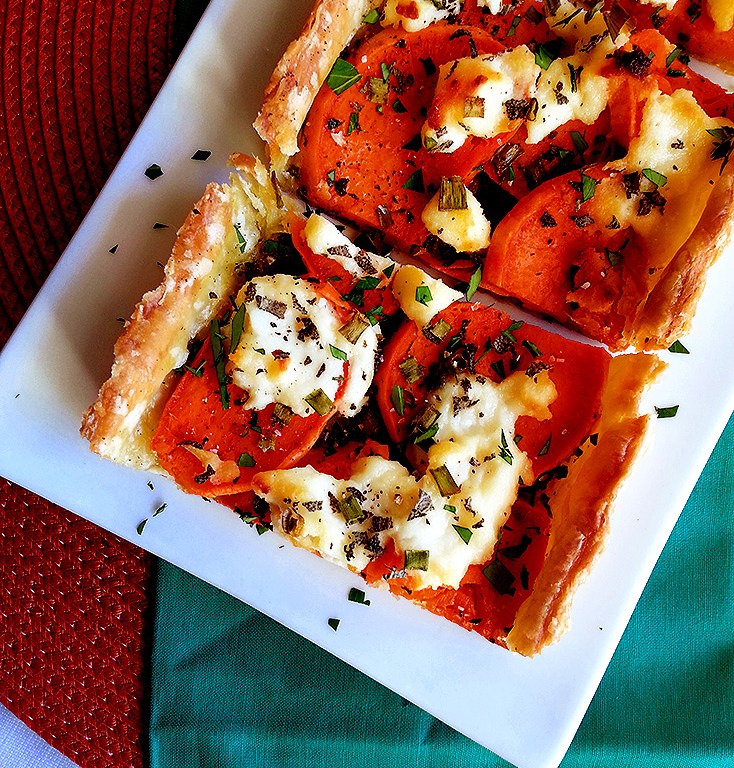 This tart is the perfect Fall-weather dish to accompany your Thanksgiving meal. Slice the tart lengthwise and cut it in small squares for an appetizer, or in larger slices as a lighter vegetarian alternative to the usual turkey centerpiece! However you serve it, it’s sure to brighten up your table.