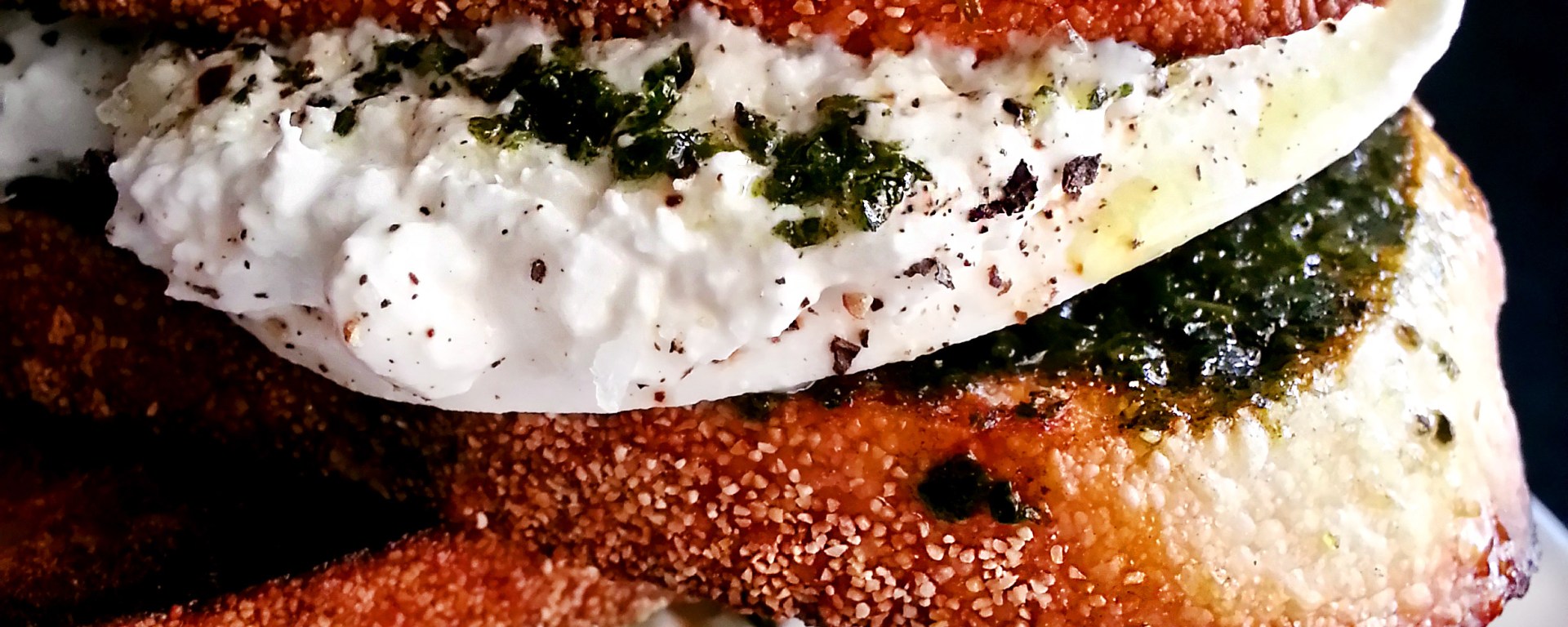 Remove toast from the oven and brush the lighter sides of the toast with the basil puree. Slice up the burrata and top two slices of toast with 4 ounces of cheese a piece. Sprinkle the cheese with a good dose of black pepper and sea salt, an extra little drizzle of oil if you wish, and a few fresh whole leaves of basil. Top each cheese half with its other piece of toast. Eat immediately to get the delightful contrast between the warm, crunchy bread and ice cold cheese.