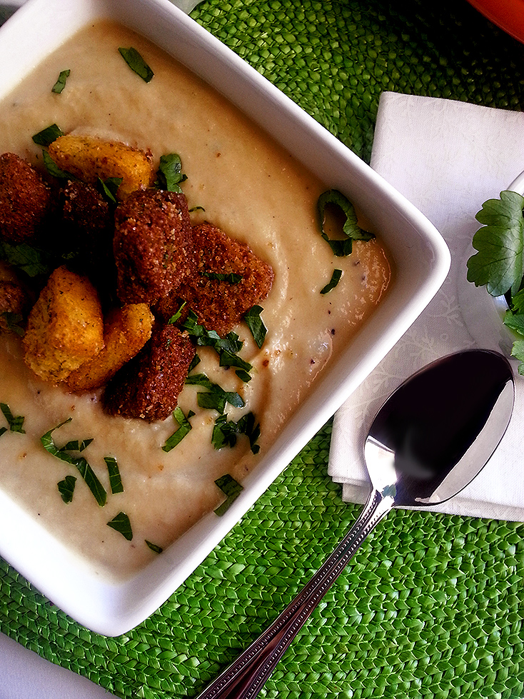 I first made this soup for a Thanksgiving starter, and was practically dreaming about it from that day on. I’ve made it about 5 times since then, and every time it seems to get better. Tender cauliflower is pureed into an otherworldly creamy soup with lots of roasted garlic, chicken stock, fresh thyme, cream, and grated parmesan cheese. It’s not as heavy as it sounds, and it makes a perfect starter to a meal, or just as a main course with some salad and good buttered bread on the side.