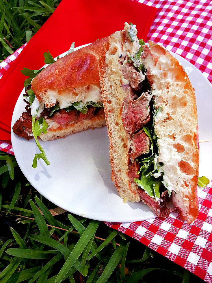 12 – steak sandwiches with arugula, roasted garlic + horseradish cream