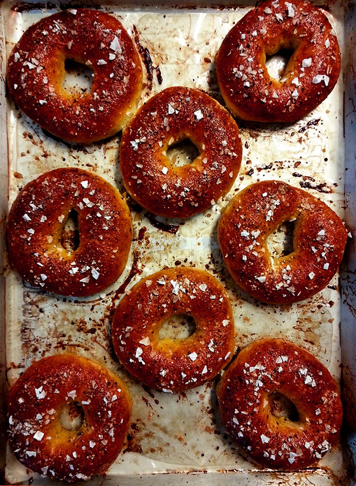 salt + pepper bagels with rosemary cream cheese