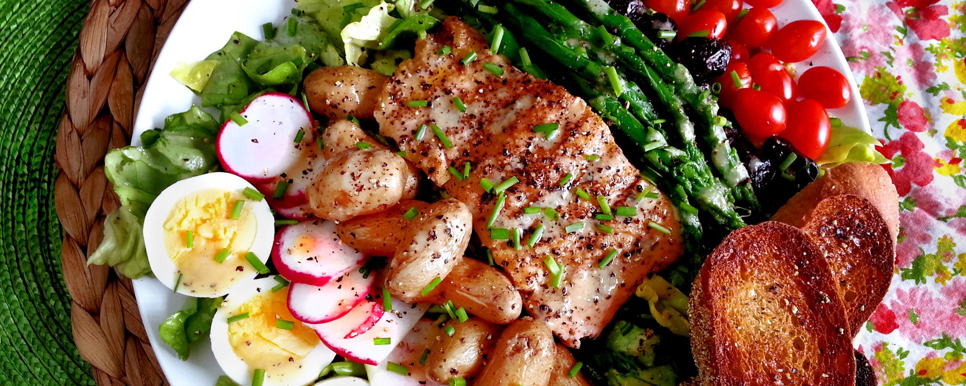 To assemble the salad: Wash and chop the butter lettuce and place in a large bowl. Drizzle with a few tablespoons of the dressing and toss by hand to coat. Divide the lettuce between two large plates, and place one piece of chilled salmon in the center of each bed of lettuce. On one side of the lettuce, pile half of the cooked potatoes, followed by half of the blanched asparagus, and half of the grape tomatoes. On the other side of the lettuce, arrange half of the olives, 1 sliced radish, and three halves of hard-boiled egg. Drizzle the top of each salad with a bit more of the dressing, and sprinkle with the minced chives. Serve with a few slices of grilled bread if desired.