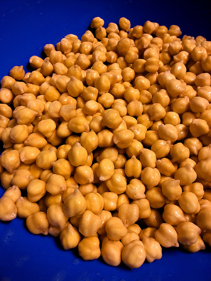 For the falafel: Place the dry chickpeas in a large bowl and cover them with water, so that they’re fully submerged by a few inches. Let the chickpeas sit uncovered at room temperature for 24 hours. Check the level of water about halfway through, and if they are absorbing so much as to be above the water, add a bit more water so they’re covered again. After the time is up, drain the chickpeas.