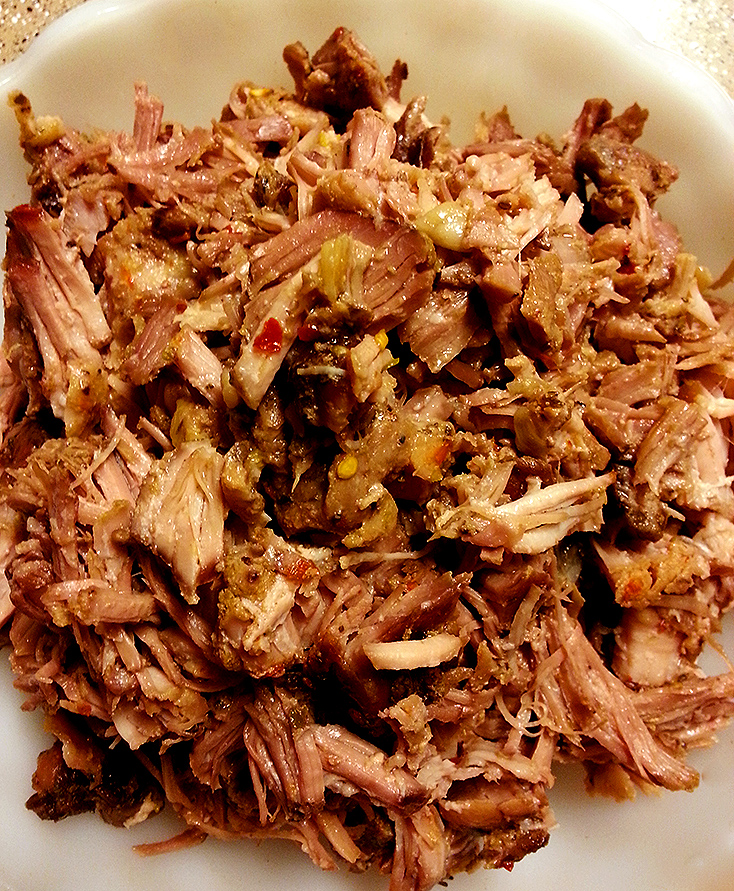 Once the meat is cooked, remove the foil from the pan. Fish out the onions and oranges and discard them. Place a large colander over a larger bowl and pour the entire contents of the pan into the colander, letting all the liquid drain out. Put the meat back in the pan and pour the liquid into a large measuring cup, or a fat separator if you have one, and let the fat rise to the surface. Skim off any fat and mix it back in with the cooked pork. Shred the pork into smallish pieces.