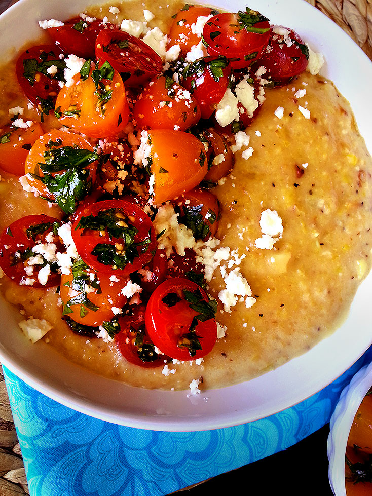 charred corn polenta with herb + tomato salad
