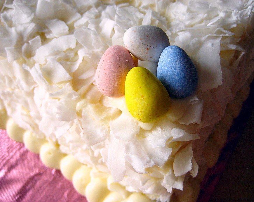 The other thing that always reminds me of Easter is coconut cake. I remember my mom or my grandma had this cartoon plastic rabbit face that you could shove against a store-bought jelly roll-style coconut cake, effectively making the cake look like the Easter Bunny. I’ve never really known why coconut cake seems so ubiquitous around Easter and springtime in general. Regardless, I’ll eat it happily whenever it’s served!