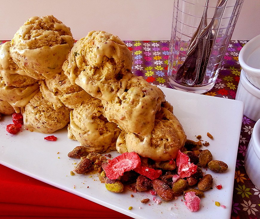 Several weeks back, Local First Arizona hosted their 4th annual Fall Fest in downtown Phoenix.  It was a wonderful day filled with local food vendors and craftspeople from around the valley. My friend Dusty joined me, and together we got to sample lots of great local food and check out plenty of other awesomeness (like some amazing handmade, vegan and organic soap from Strawberry Hedgehog!). One of the food samples that stood out to me was the pistachio gelato from Grateful Spoon. Up until then, the only pistachio ice cream of any type I’d ever had was the passable version from Ben & Jerry’s. Grateful Spoon’s gelato was thick and rich, with none of the overabundance of almond flavoring so often added to pistachio products. It was chock full of little bits of roasted pistachios, so their flavor was front and center. I knew after I tasted it that I wanted to make my own at home!