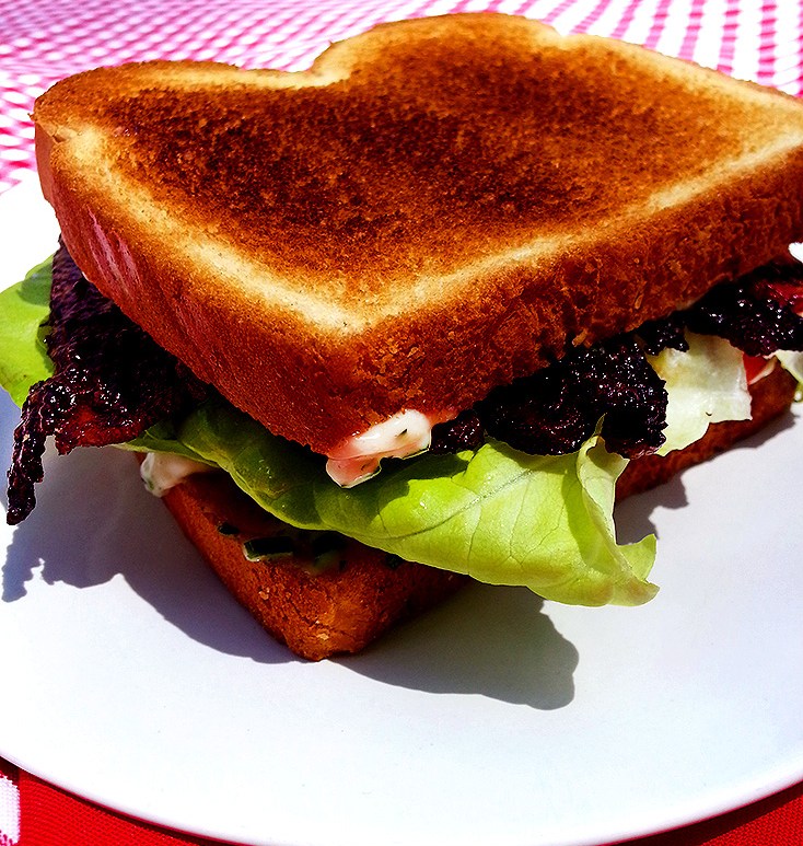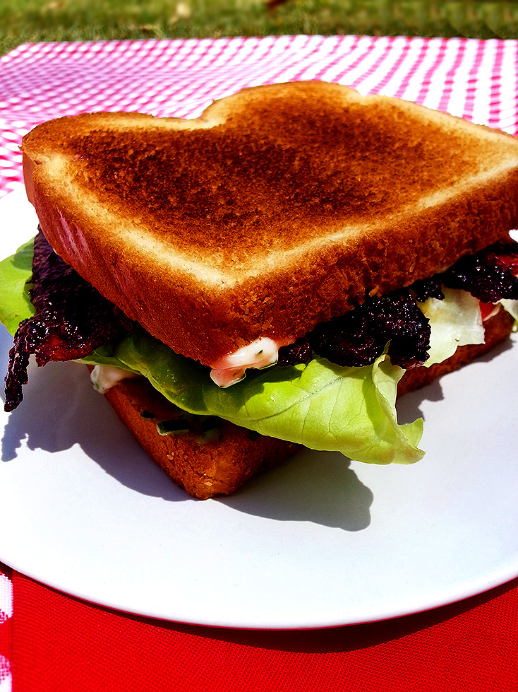I did discover that if I dress up mayo with lots of fresh parsley and chives, it’s insanely good. What would this new fancy mayo be good on? Oh, how about some summertime BLTs with oven-cooked mustard and brown sugar bacon, butter lettuce leaves and some super awesome local sliced tomatoes?